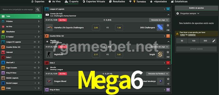 O Mega6 oferece uma grande seleção de opções de apostas em e-sports com probabilidades competitivas